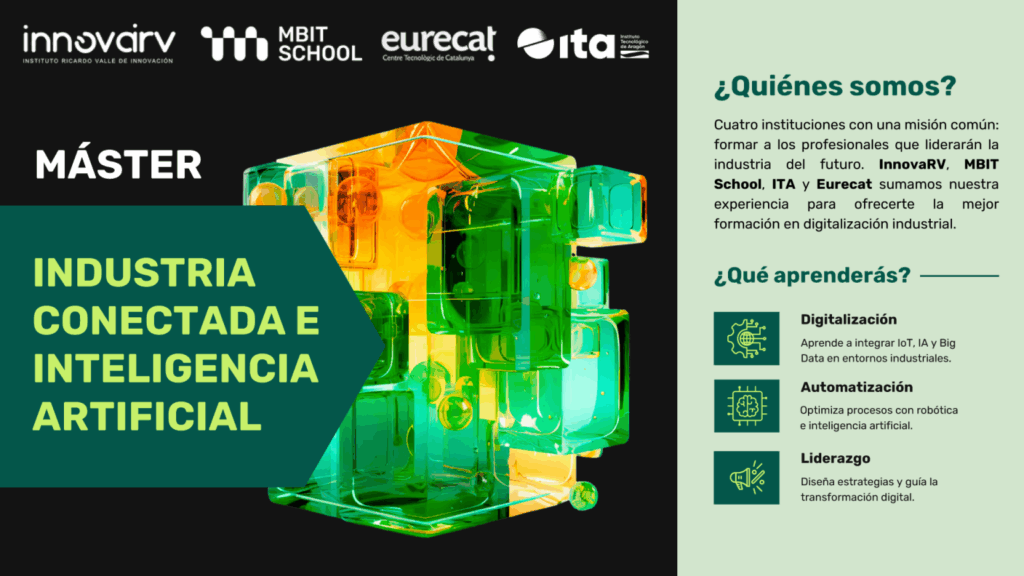 El Instituto Tecnológico de Aragón ITA colabora en el Máster en Industria Conectada e Inteligencia Artificial. Este Máster está promovido por Innova IRV, organizado por MBIT School, en colaboración con ITA y Eurecat como docentes y socios locales.